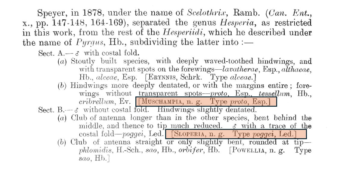 Both names were established on the same page of Tutt’s 1906 publication, with Muschampia appearing before Sloperia. The chronology is unambiguous, as the author described (wrote) the former first, followed by the latter.